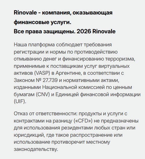 Деятельность компании нелегальна для работы с российскими инвесторами. У Rinovale нет лицензии ЦБ РФ и документов о регистрации в открытых реестрах. Упоминание об аргентинских нормах ничем не подтверждено.