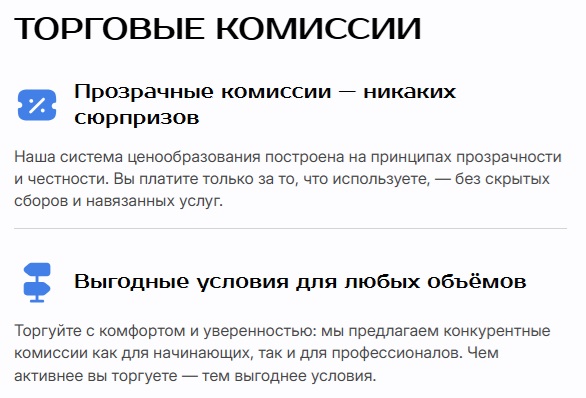 Комиссии компания называет прозрачными и выгодными. Говорят, система построена на честности без скрытых платежей. Чем активнее торгуешь, тем условия становятся лучше. Правда, конкретных цифр и размера комиссий на сайте нет.