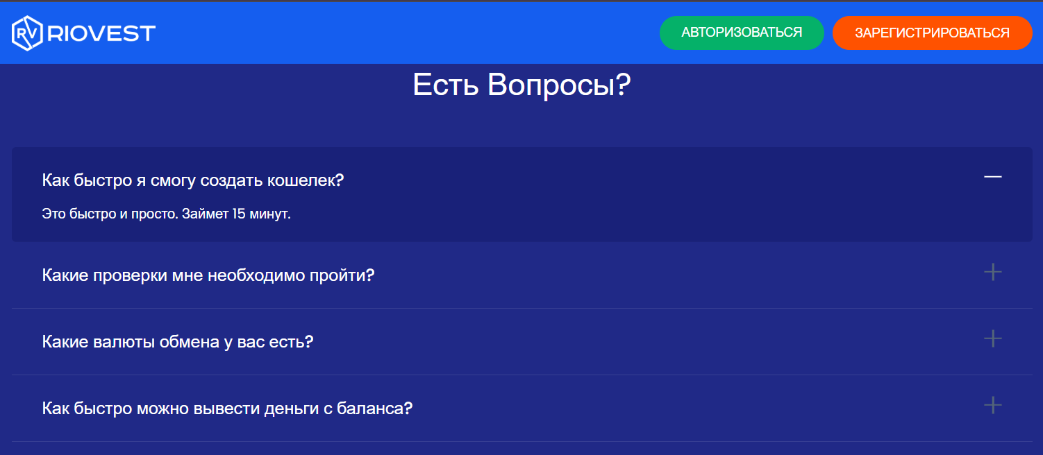 Условия для клиентов Riovest описываются в разделе Faq, а все, что из этого известно – весьма скудные данные: