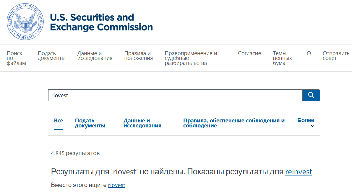 Проверка на официальном сайте регулятора показывает, что организация Riovest здесь не зарегистрирована.