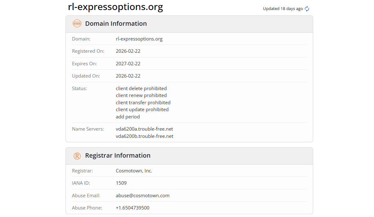 По информации Whois, домен проекта Rl ExpressOptions org был зарегистрирован в феврале 2026 года через регистратор Cosmotown. На главной странице сайта обещают быструю доходность, бонусы за первое пополнение баланса на Royal Express Options и простую навигацию для новичка.