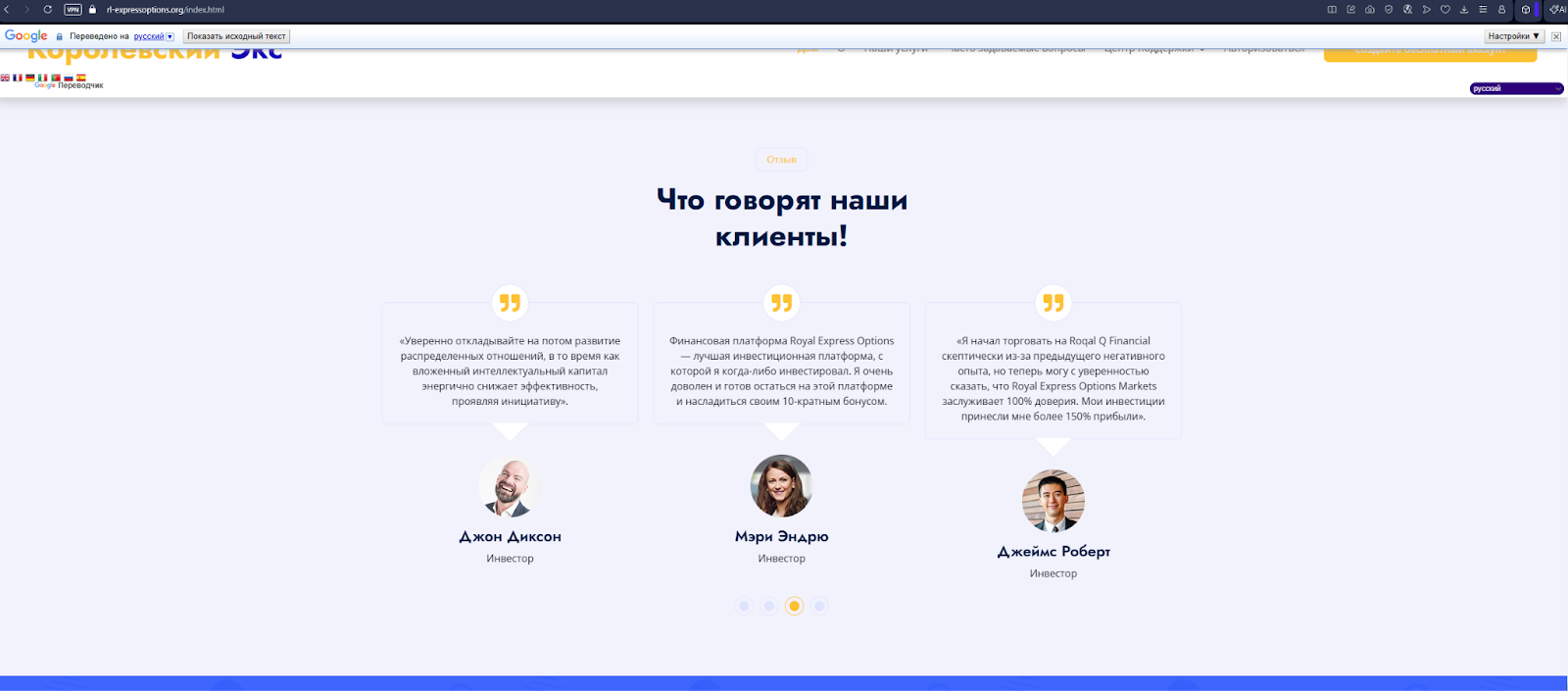 В сети немного упоминаний о проекте, но большинство негативные. Тем не менее маркетинговые блоки сервиса переполнены восторженными сообщениями. Люди сообщают, что удвоили капитал за неделю, благодарят поддержку и активно советуют приглашать друзей в Royal Express Options.