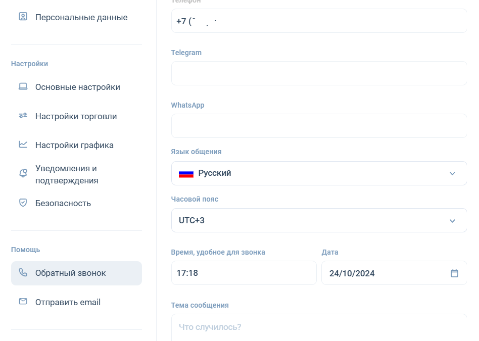 Все другие вкладки пусты. Среди них есть вкладки “избранное”, “открытые”, “журнал событий”, “история”, “настройки” и “уведомления”. Для чего нужно столько пустых вкладок, суть которых одна и та же, – отображение информации по возможным сделкам, непонятно.В настройках сайта содержатся данные профиля, пару сомнительных торговых инструментов, и схема связи с командой разработчиков сайта – обратный звонок или связь по емайл.
