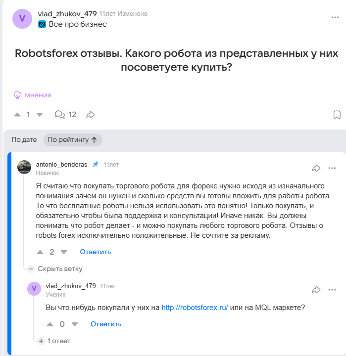 В целом репутация у RobotsForex спорная. Заявлений о мошенничестве не встречается, а наличие комментариев указывает на заинтересованность аудитории.