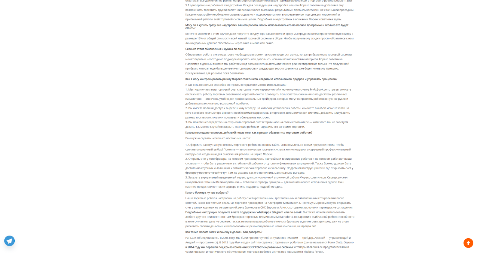 На главной странице «РоботсФорекс» представлены разделы с роботами, блог, ответы на вопросы, юридические документы и вход в личный кабинет. Для просмотра полной информации о стоимости услуг, размерах бонусов и процентах партнерки нужно авторизоваться. В публичной информации заявлено, что продажа ведется по модели права пользования программой без владения ею.