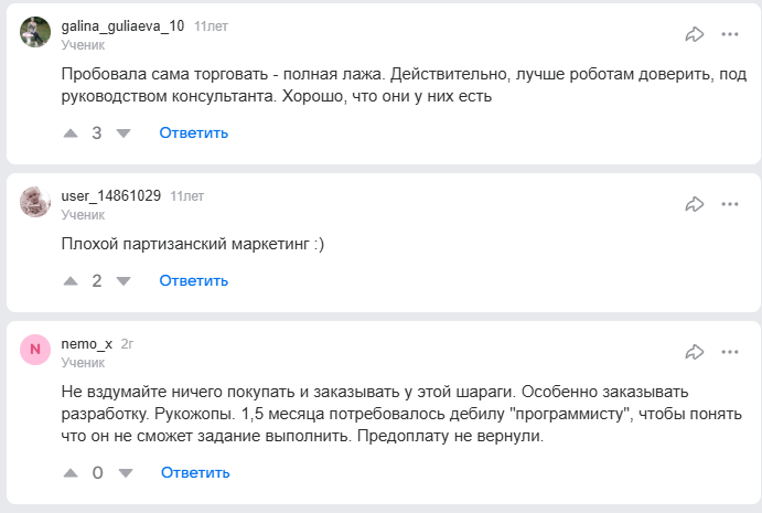 Негативные комментарии сообщают о просадках, зависаниях и сливах депозита уже на первой неделе. Есть претензии к тому, что возврат денег почти невозможен, а результаты на демо-счетах сильно отличаются от реальных. Также в отзывах иногда поднимается тема скрытых комиссий при выводе партнерских начислений.