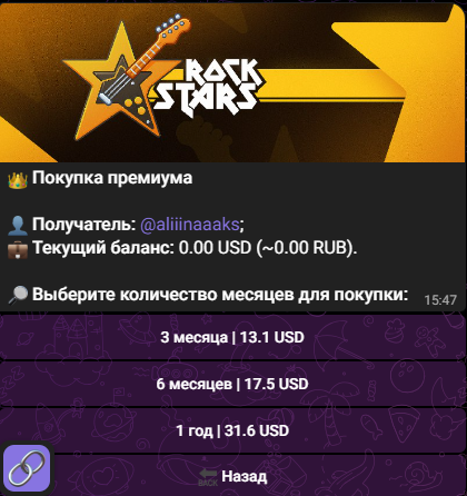 Купить звезды можно как для себя, так и в подарок другому пользователю мессенджера. Минимум определен в 50 единиц за 0.83 USD – стоимость на 19.11.2025. Максимум в одной заявке Rock Stars bot можно проставить 10 000 звезд, которые будут стоить 166.50 USD. Подписка Премиум оформляется по тому же принципу. На ноябрь 2025 года доступно: