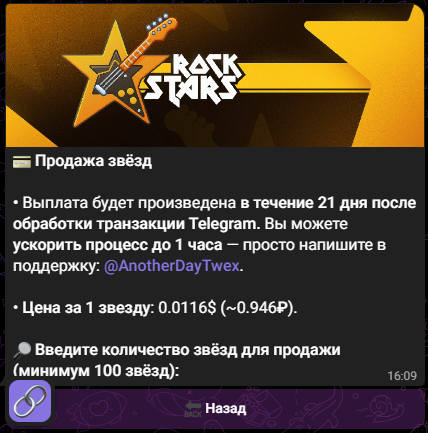 Продать звезды через бот тоже можно. Выплата будет произведена в течение 21 дня после обработки транзакции Telegram. Чтобы ускорить процесс до 1 часа, достаточно просто написать все в ту же поддержку AnotherDayTwex. Rock Stars в Telegram устанавливает цену за одну звезду на 19.11.2025 в $0.0116, это примерно ₽0.946. Минимум звезд для продажи определено в 100 единиц.