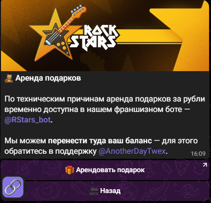 Rock Stars в Telegram упоминает и о возможности так называемой аренды подарков, но на ноябрь 2025 года эта функция временно недоступна – только через «франшизный» бот. Чтобы перенести баланс в другую систему, необходимо обратиться к саппорту Another Day.