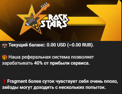 Мы не можем рекомендовать Rock Stars bot в Telegram, куда безопаснее выбирать для покупки и продажи звезд Тг более проверенные сервисы с положительными отзывами и соответствующей репутацией надежного магазина.