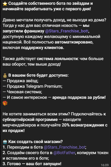 Сервис позволяет создавать и собственного бота по звездам и начать зарабатывать с его помощью уже с первого дня активации. Франшиза Stars Franchise bott якобы доступна каждому желающему с минимальной наценкой. Все полностью автоматизировано, включая поддержку клиентов Rock Stars в Telegram. В боте будет доступно: