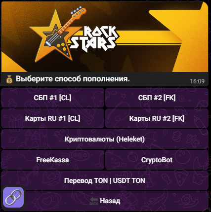 О Rock Stars bot отзывы в интернете на ноябрь 2025 года не публикуются. По всей видимости, сервис был запущен только недавно и еще не успел стать популярным. Бот якобы помогает покупать Telegram Stars, подписку Premium и TON по минимальной цене. Единственный контакт для связи – некий AnotherDayTwex, который даже не упоминает собственного имени. В обзоре проанализируем возможности бота на ноябрь 2025 года, насколько безопасным и надежным является сервис.