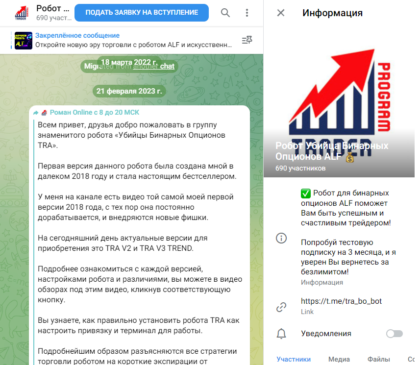 Проект @tra_bo_bot создан весной 2022 года. И хотя в его названии есть «бот», по факту это просто ТГ-канал с всего 690 участниками. Буквально все публикации здесь не имеют просмотров, а суть их в том, чтобы рекламировать партнерские ссылки на сторонние сервисы.