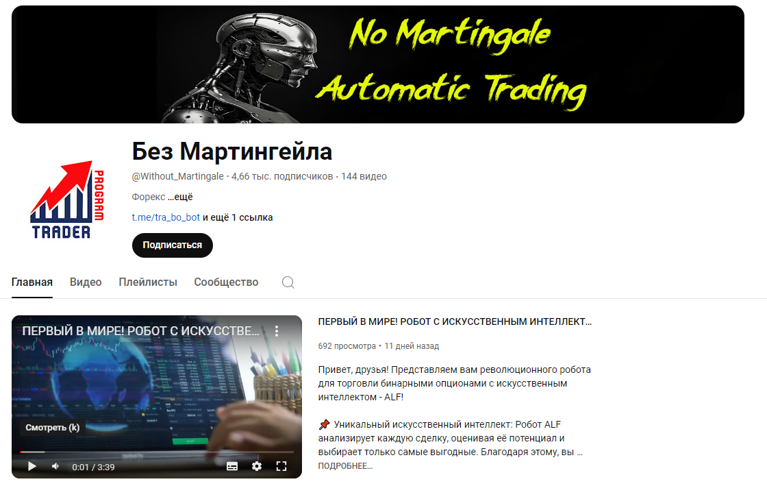 На Ютубе проект автора называется «Без Мартингейла» и работает по ссылке @Without_Martingale. Канал создан в 2016 году. Имеет почти 150 видео. Но подписчиков всего 4,6 тысячи, а просмотров — 100+ тысяч.
