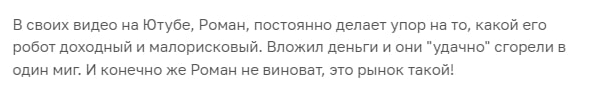 90% роликов — прямая или нативная реклама роботов автора. Остальные 10% видео информационные, но какой-то действительно уникальной или ценной информации по теме в них нет.Сообщество инвестора в ВК