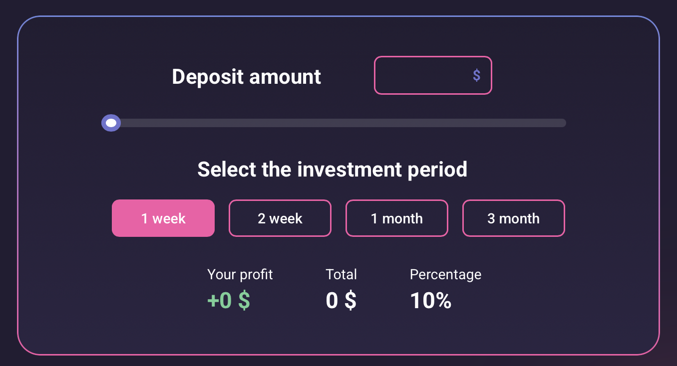 Конкретных тарифов или комиссий за торговлю на Roxbyt в открытом доступе нет — сайт не раскрывает размеры сборов за торговлю или вывод. Минимальный депозит тоже не прописан четко, но калькулятор позволяет «попробовать» с любой суммы и сразу показывает потенциальный доход.