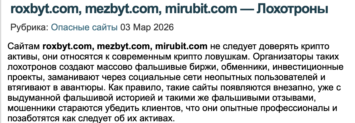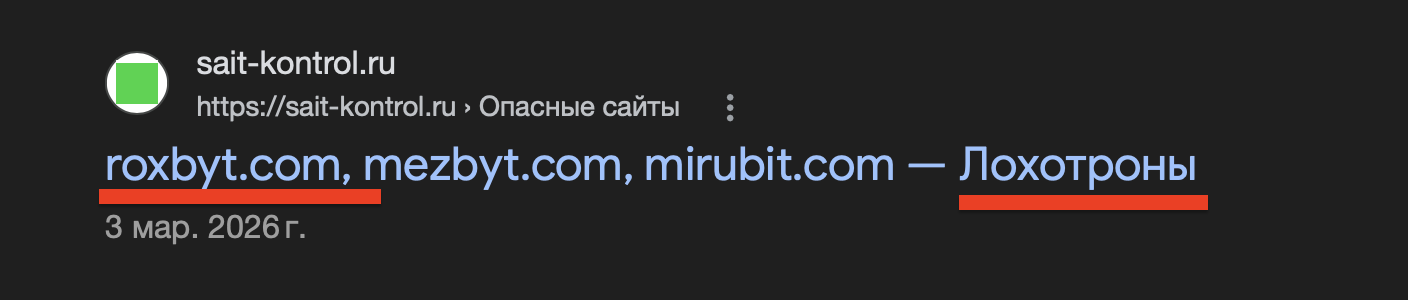 Дальнейший серфинг по сети выявил наличие У Roxbyt целой вереницы клонов, включая мошеннические платформы mezbyt.com, mirubit.com и другие. Все они работают по известному нам сценарию: одинаковый дизайн, фейковые отзывы, обещания профита и внезапное исчезновение средств.