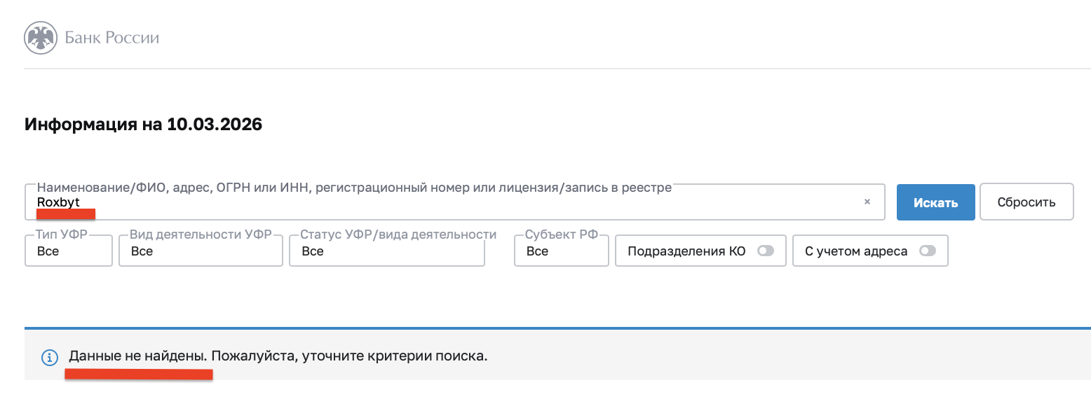 Единственный активный источник платформы в интернете — сайт Roxbyt com. На самом сайте вообще нет ссылок на соцсети или контакты — только форма регистрации и призывы «начать инвестировать сейчас».