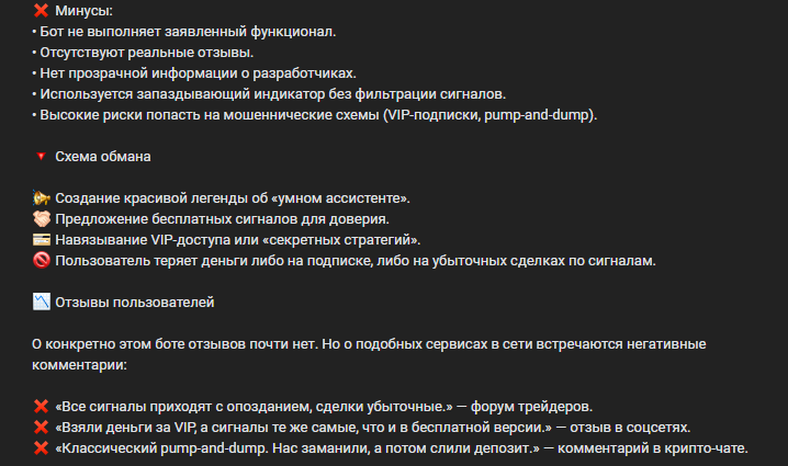 • невыполнение ботом Rsi Crypto Signals заявленного функционала;