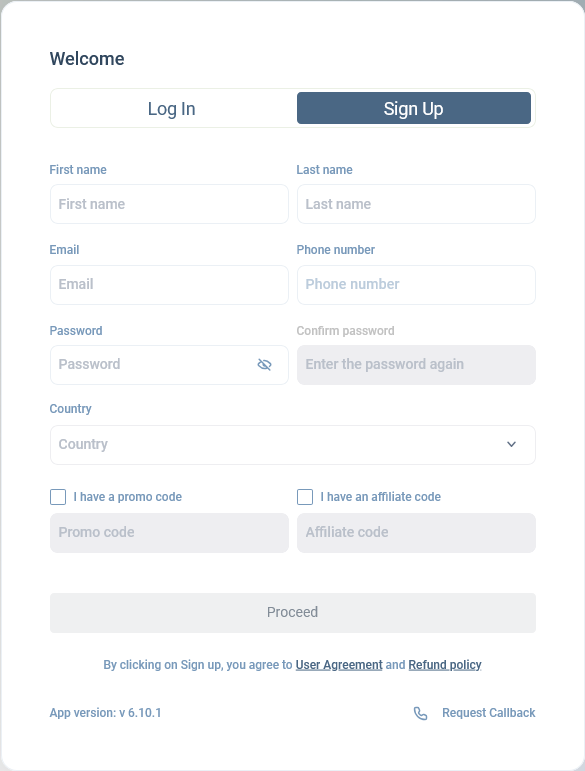 Перед тем, как торговать, нужно пройти регистрацию, заполнив анкету.