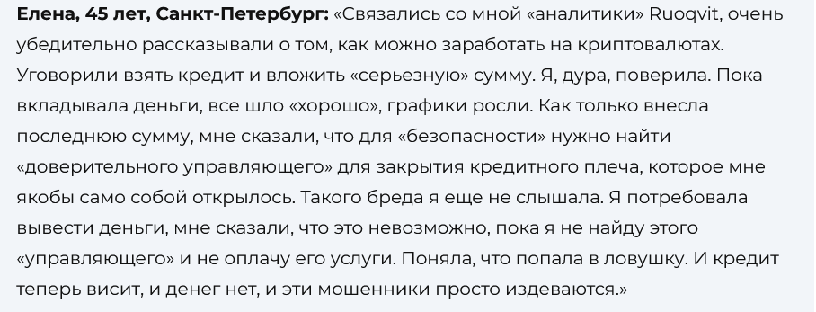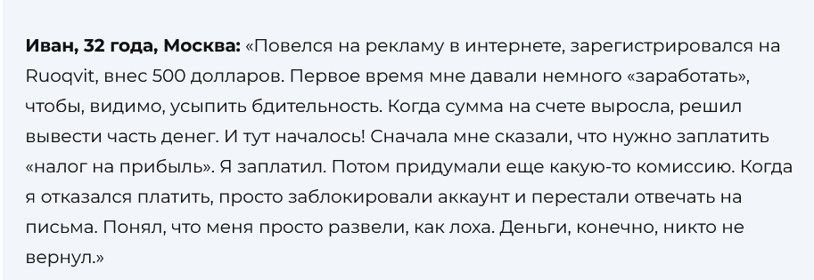 Также в отзывах о RuoqVit pro пользователи отмечают, что аналитики проекта умеют убеждать, обещают быструю прибыль. После того, как клиент решает вывести деньги, менеджеры начинают требовать доверительного управляющего для закрытия кредитного плеча. Деньги так и не вернули.