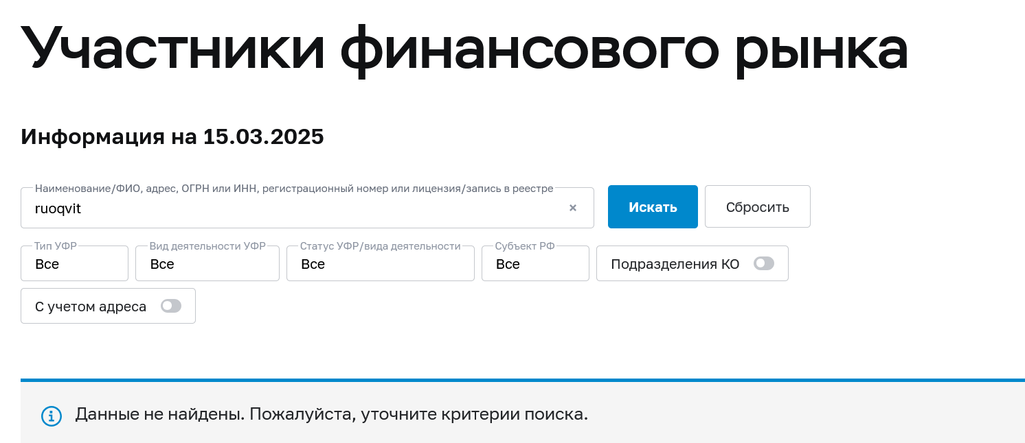 Доменное имя биржи RuoqVit, как показала проверка, в марте 2025 года свободно.
