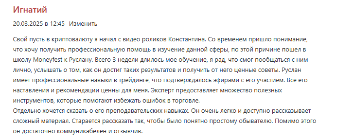 Отрицательных отзывов об инвесторе Руслане Амирове и его методах преподавания в сети нет. Один из довольных юзеров говорит о пользе полученных знаний и инструментов.