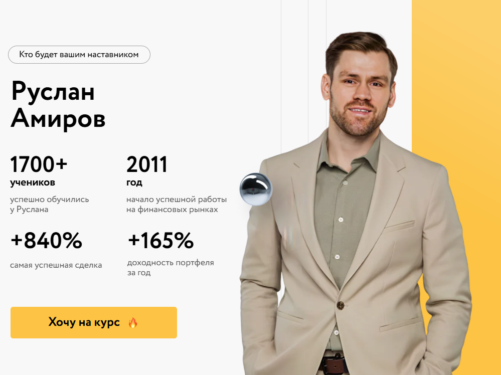 Руслан Амиров пытается показать из себя хорошего специалиста в трейдинге. Но на рынке он не известен . Да и его курсы и вся деятельность не пользуются особой популярностью. Так что лучше не связываться с ним и не покупать его продукты. Вряд ли там будет что-то полезное. Я более чем уверен. Таких Русланов полный интернет. если каждому платить, покупать их не востребованные продукты можно разориться!