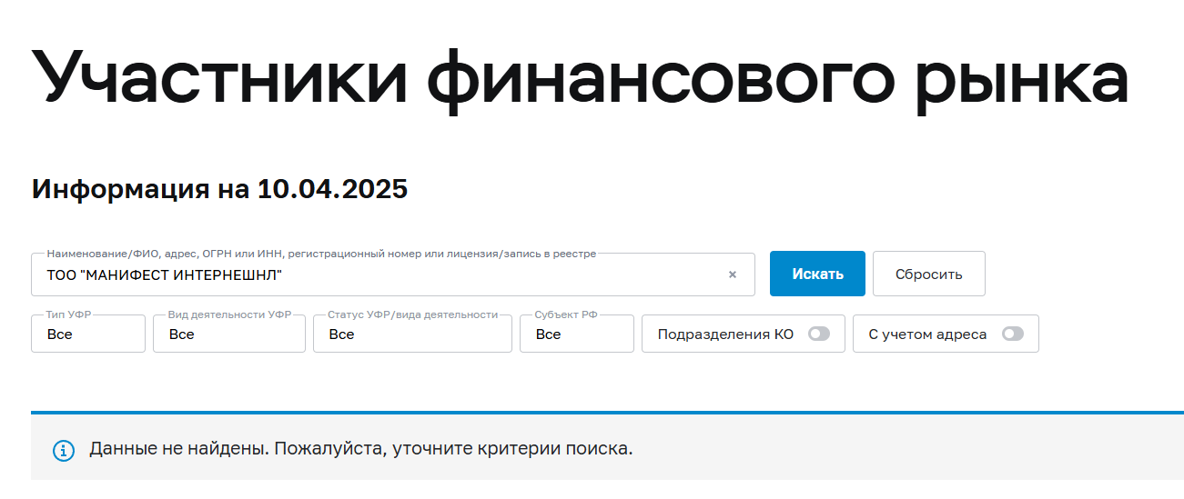В сети есть данные, что онлайн-школа MoneyFest International принадлежит компании ООО «МФ Финанс», однако на сайте указана организация «ТОО Манифест Интернешнл». Анализ показал, что у нее нет разрешения на деятельность в России.