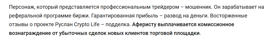В сети обнаружен всего один обзор, в котором автора проекта называют мошенником. Правозащитники обвиняют его в заработке на рефералах, которые теряют инвестиции на его торговых рекомендациях. Отрицательные либо положительные отзывы о «Руслан Крипто Лайф» в интернете не найдены.