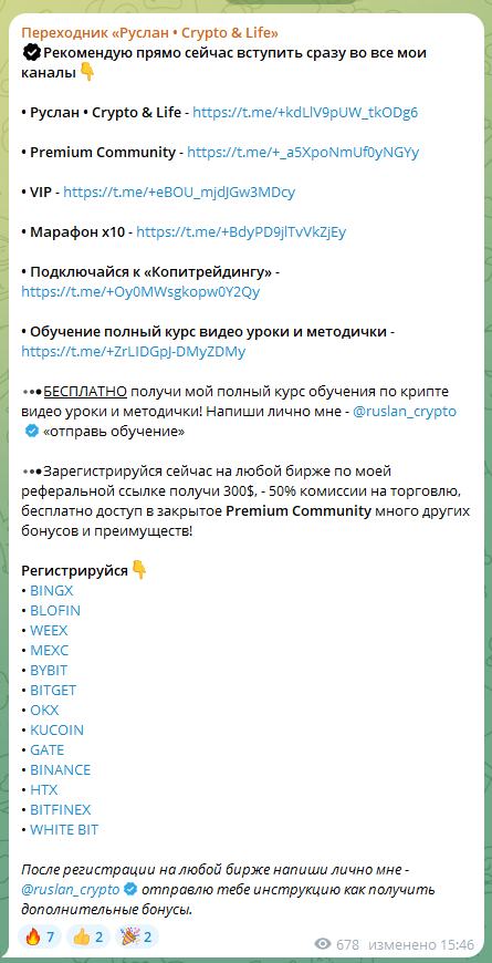 Все каналы направлены на привлечение рефералов в партнерские программы криптобирж.