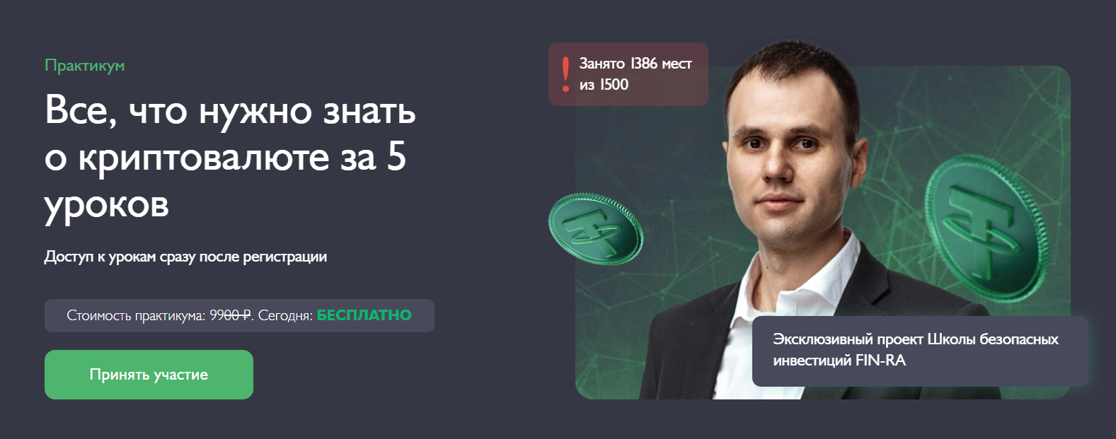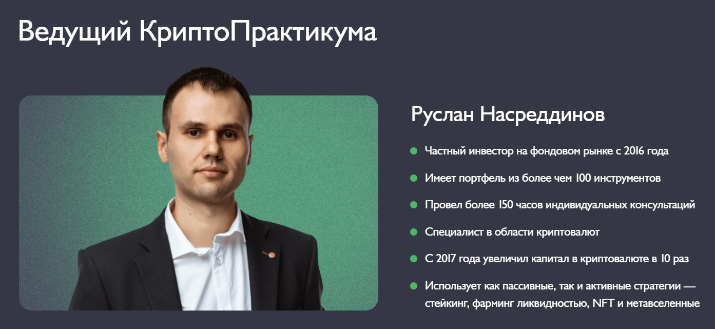 Курс «Все, что нужно знать о криптовалюте за 5 уроков» предлагают за ₽9,900, но во время проверки в феврале 2026 года действовала акция, где обучение с Русланом Насреддиновым можно было пройти бесплатно.