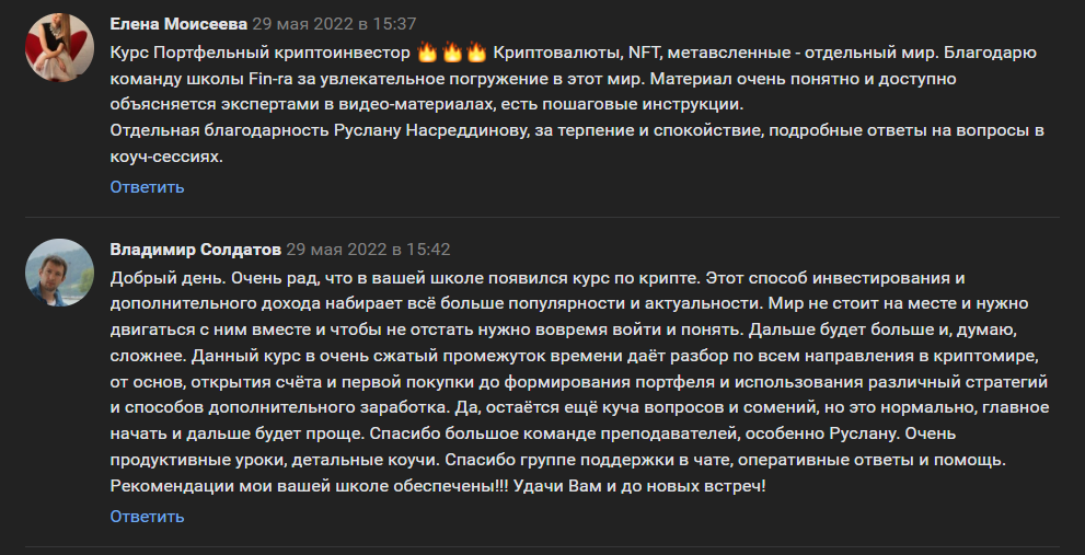 В сети сложно найти отзывы об инвесторе, а какие есть во ВКонтакте, выложены еще в 2022 году, хотя пользователи в основном остались довольными. Больше комментариев пишут по поводу школы Fin-Ra, а не о Руслане Насреддинове, а так как информацию нельзя назвать актуальной, сделать конкретный вывод о репутации нельзя.