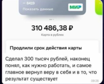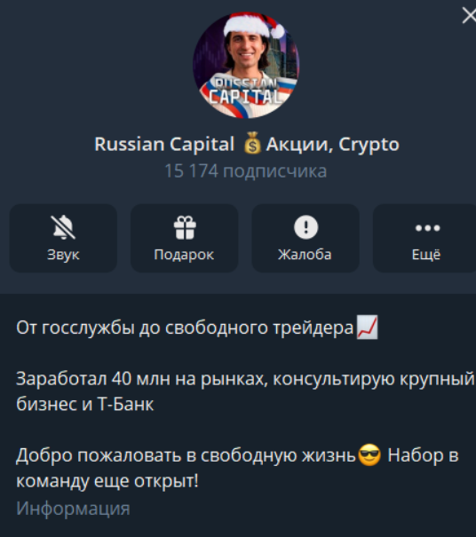 «Russian Capital Акции Crypto» собрал в Телеграмм более 15 000 подписчиков. Виктор сообщает там, что заработал более сорока миллионов и является консультантом крупного бизнеса и Т-Банка. Никаких документов, подтверждающих его работу с ними в качестве консультанта Виктор не приводит.