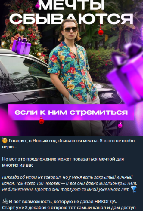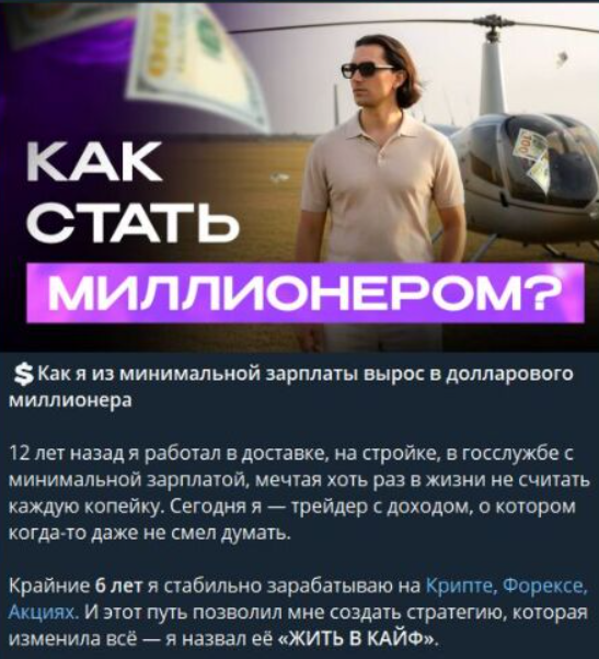 Также Виктор предлагает вступить в его закрытый канал, где он общается со своими клиентам. Там состоит 100 человек и все они давно стали миллионерами, следуя советам Виктора, как заявляет сам трейдер.