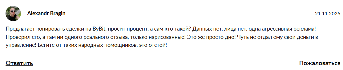 У «Russian Capital Акции Crypto» в сети негативные, поскольку Виктора подозревают в разводе и говорят, что никаких реальных данных о себе он не дает. Доверять свои деньги трейдеру не рекомендуют и копировать его сделки на ByBit не стоит, как говорят люди.
