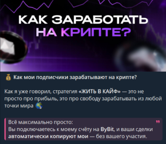 Russian Capital от Viktor Profit предлагает подключиться к стратегии «Жить в кайф» и заработать на криптовалютах вместе с трейдером. Автор обещает не просто прибыль, а возможность заработать в любой точке мира, подключившись к счету Виктора на ByBit и автоматически копируя его сделки.