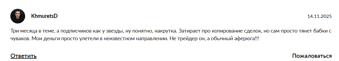 Виктор зовут аферистом, который накручивает себе подписчиков. Комментаторы говорят о том, что они потеряли деньги из-за Виктора и ушли в убыток.