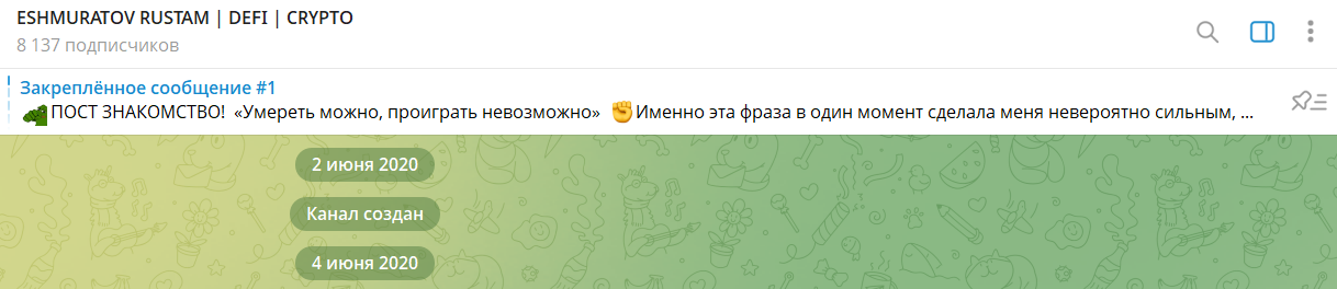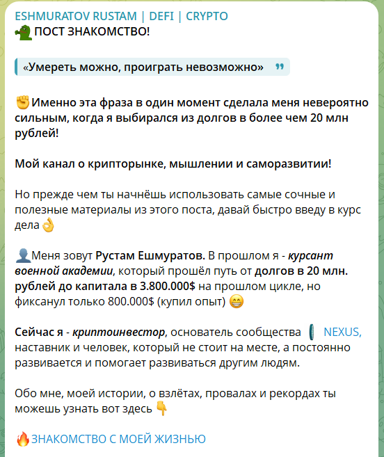 Сам телеграмм-канал был создан в июне 2020 года. Админ начинает вести проект с мотивационных постов, призывающих не бояться начать зарабатывать на рынке. Только спустя месяц Rustam Eshmuratov оставляет приветственное сообщение. В прошлом он курсант военной академии, но жизнь сложилась так, что Рустам Ешмуратов начал заниматься криптой – прошёл путь от долгов в ₽20,000,000 до капитала в $3,800,000.