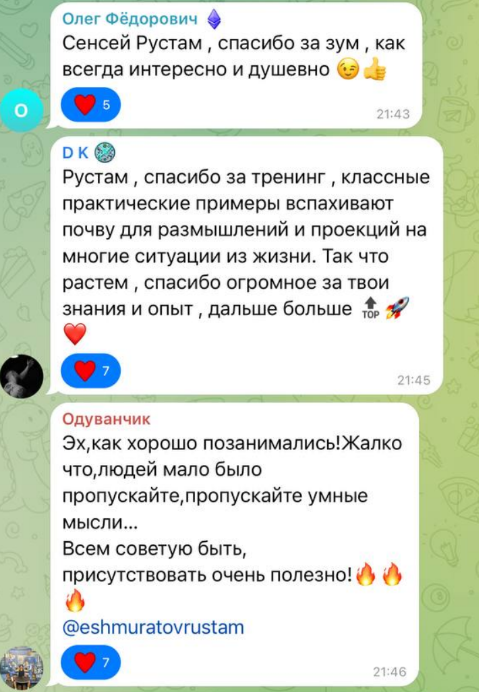 Отзывы о Рустаме Ешмуратове можно найти на самом телеграмм-канале Eshmuratov r – это скрины переписок с довольными подписчиками, которые принимали участие в прямых трансляциях, марафонах и мастер-классах. Не исключаем, что эти мероприятия могли оказаться полезными и помочь разобраться, как торговать на рынке, но при не забываем, что подобные доказательства своей успешности легко подделать с помощью простого редактора.