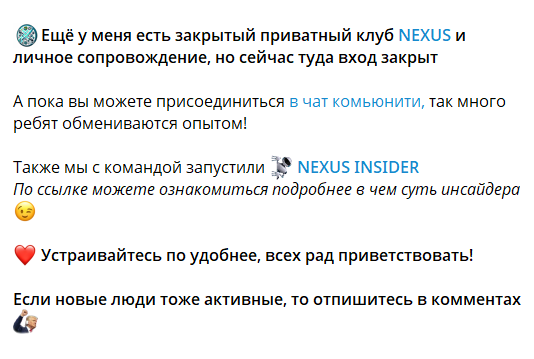 Рустам Ешмуратов регулярно напоминает аудитории, где торгует мемами и альтами – оставляет реферальные ссылки. Успешность своих сделок на этих площадках админ не показывает. Параллельно трейдер участвует в развитии проекта NexusCryptopro – сообщество про финансы, мышление и спорт. Других посторонних ссылок нет.