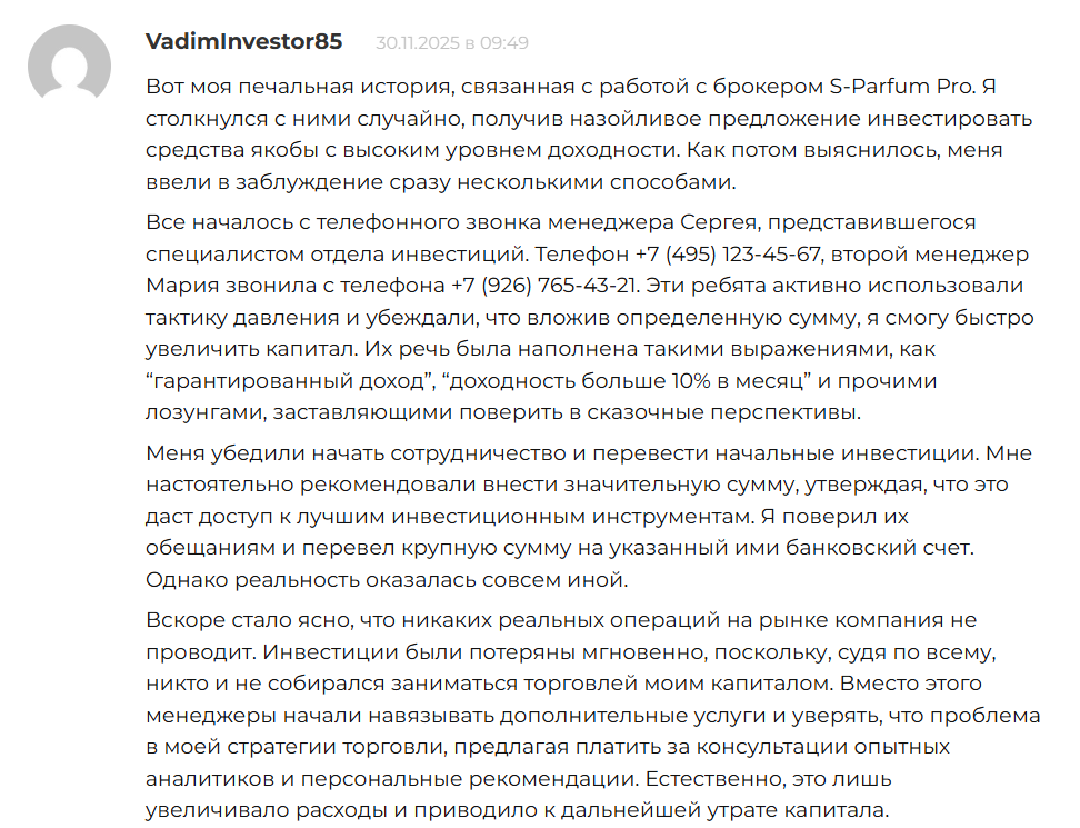 Сайт S Parfum Pro начал работу в 2025 году. Настоящей информации о владельцах этого сервиса нет. Они предпочитают работать анонимно. Плюс к этому, создатели проекта не демонстрируют лицензию на оказание финансовых услуг.