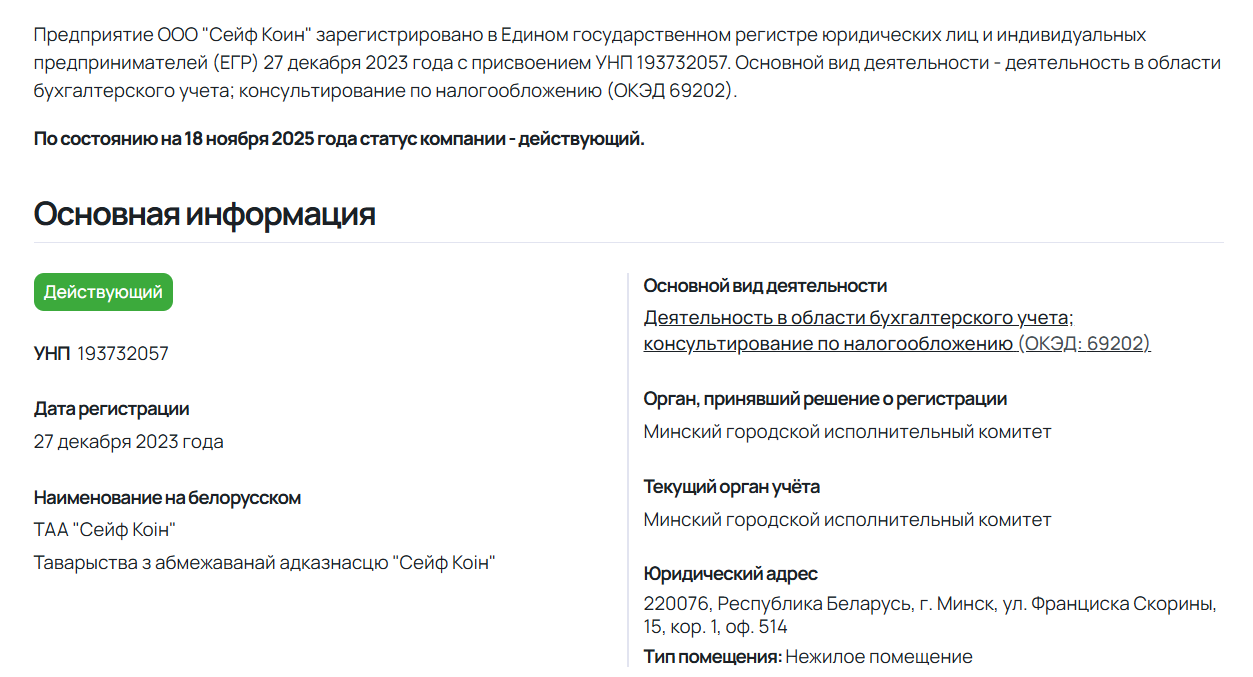 Организация занимается бухгалтерскими услугами, поэтому вряд ли относится к обозреваемому проекту «Сеиф Коин», который связан с криптовалютой. О кошельке никаких подробностей не пишут, а большинство упоминаний в сети связаны с вопросами, как вывести отсюда деньги.