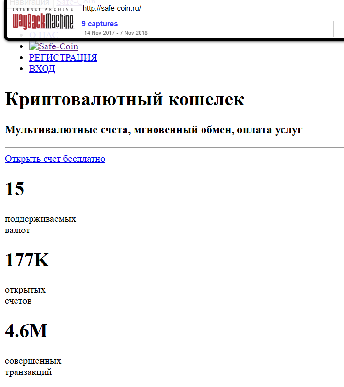 Какие были комиссии и что именно предлагали владельцы проекта «Сейф Койн», неизвестно, а также нет никакой информации о профилях в социальных сетях. Проверка на сервисе Web Archive показала, что сайт SafeCoin появился в 2017 году, хотя статистика похожа на обман, потому что написано про 177 000 счетов и количество транзакций 4 600 000.