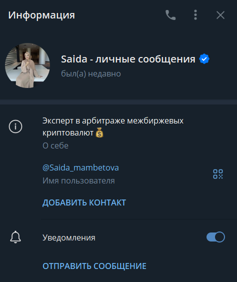 Для связи с инвестором можно использовать ее телеграмм-аккаунт под ником Saida Mam, в нем говорится, что инвестор стала экспертом в арбитраже межбиржевых криптовалют, но доказательств этому нет, а сам профиль Мамбетовой Саиды Армановной остается пустым.