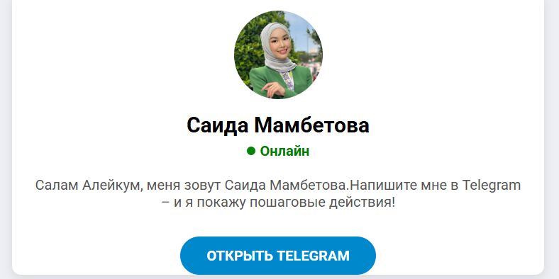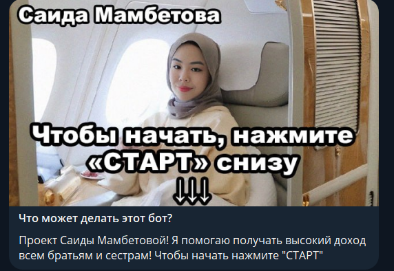 Саида Мамбетова – криптовалютный инвестор и финансовый советник, которая предлагает заработок на вложениях и трейдинге на любых платформах. Ее проект якобы помог выйти на пассивный заработок с инвестициями множеству людей, но насколько правдивы такие данные – неизвестно. Пользователям нужно только написать лично владелице бота, а далее остается только сотрудничать и получать прибыль.