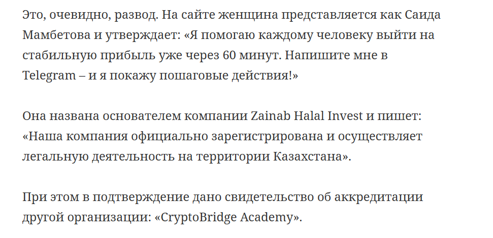 В интернете комментарии о работе трейдера встречаются редко, но нам удалось найти один из таких. В нем рассказывается, что инвестор обещает только официальную работу и имеет зарегистрированную компанию Zainab Halal Invest, но представленные ею документы на деле принадлежат некой CryptoBridge Academy.