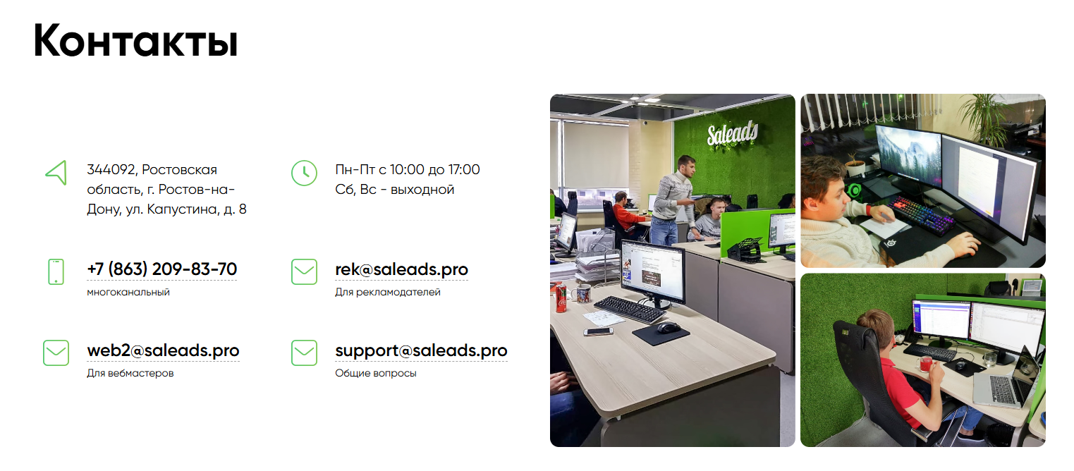 Работает «Сейлидс» также и в оффлайн-режиме через офис в Ростове, а для связи использует телефон +78632098370, а также электронную почту support@saleads pro и другие.