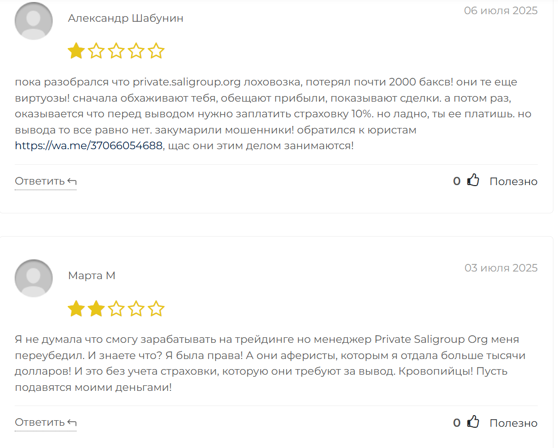 SaliGroup имеет множество негативных отзывов. Все они указывают на мошенничество со стороны платформы. Пользователи сообщают, что после внесения депозита вывести деньги невозможно. При попытке вывода компания требует дополнительные платежи. После оплаты этих сборов аккаунт часто блокируется, а деньги исчезают.