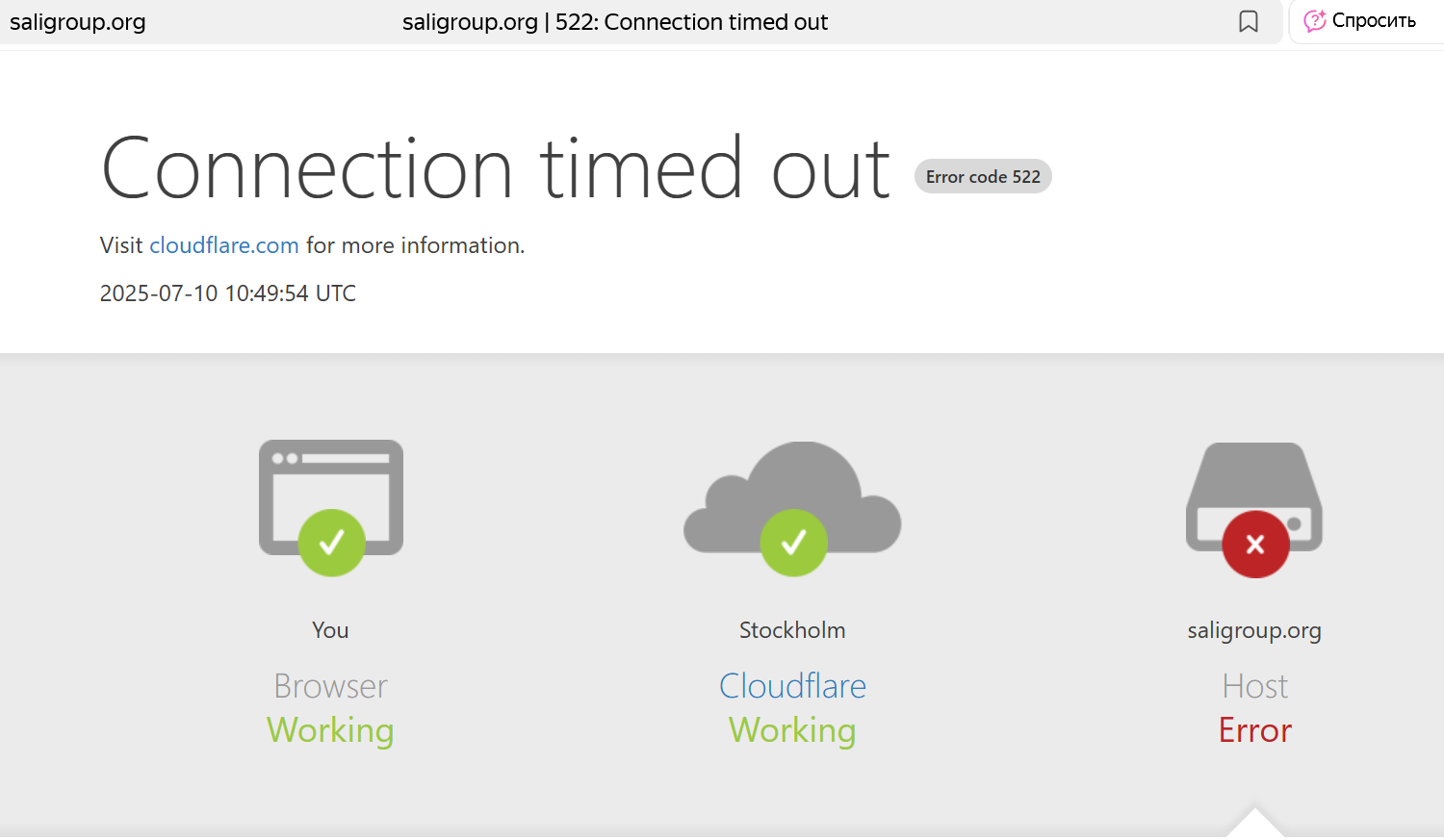 Основной домен Saligroup org предназначен для предоставления общей информации о платформе. Однако доступ к сайту затруднен. Без использования VPN-сервисов сайт выдает ошибку и не загружается. В некоторых регионах это может быть связано с блокировкой домена. В России функциональность для пользователей также ограничена.
